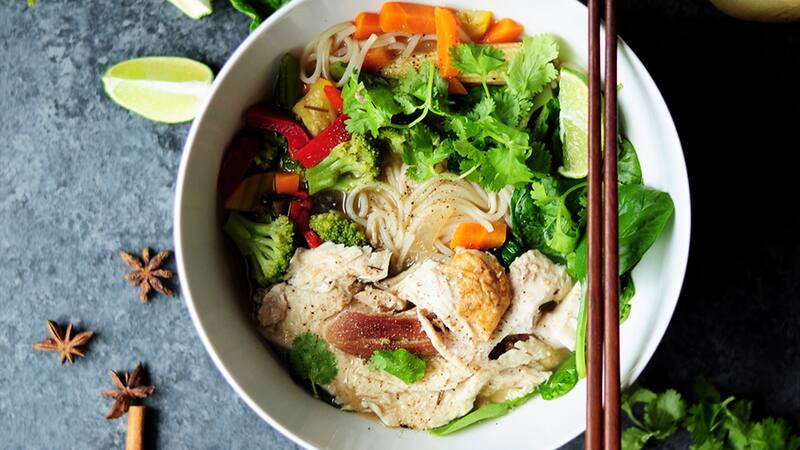 3. Para el montaje, hervir el caldo a fuego alto. En un pocillo de cerámica disponer un poco de pollo desmenuzado, fideos de arroz, dientes de dragón, cebolla morada y cebollín, y sumergir los ingredientes con el caldo hirviendo por 1 minuto. Decorar con un poco de hojas de cilantro, finalmente rociar con un poco de aceite de ají si se quiere.
