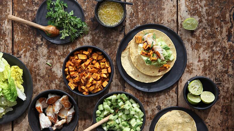 6. Para terminar, poner las tortillas a calentar en un tostador o el horno, servirlas con el pescado, camote ensalada de pepino, lechuga y un chorrito de la salsa de tahine.