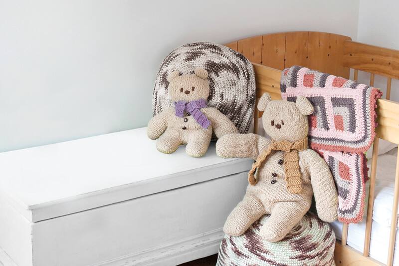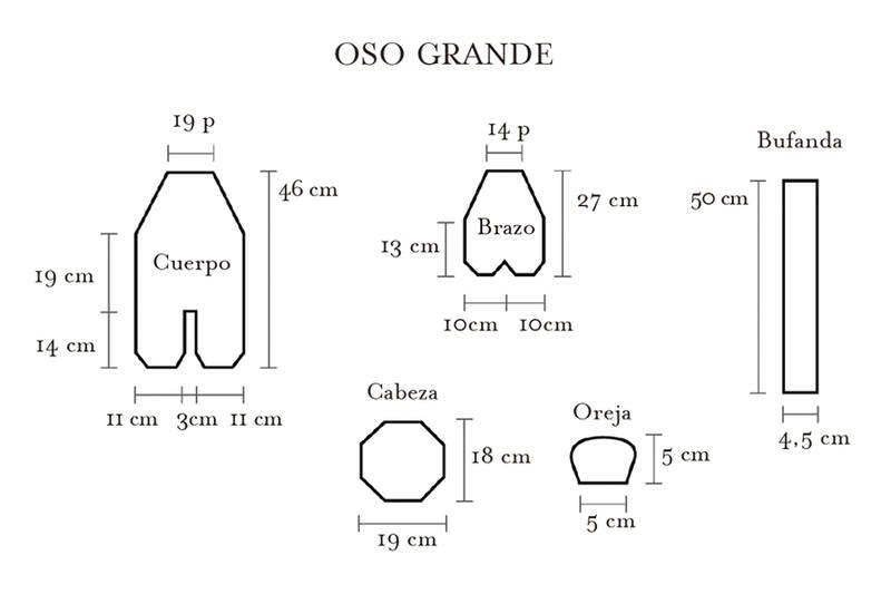 Terminación: unir los brazos al cuerpo y coser por todo el contorno con puntada invisible. Rellenar con vellón. Coser la cabeza y rellenarla, coser las orejas, rellenarlas y ubícarlas sobre la cabeza. Remallar la cabeza al cuerpo, bordar con lana café los ojitos y la nariz. Tejer una bufanda a crochet de 7 p enteros dobles (5 p enteros dobles), y 50 cm (40 cm) de largo, rodearla al cuello.