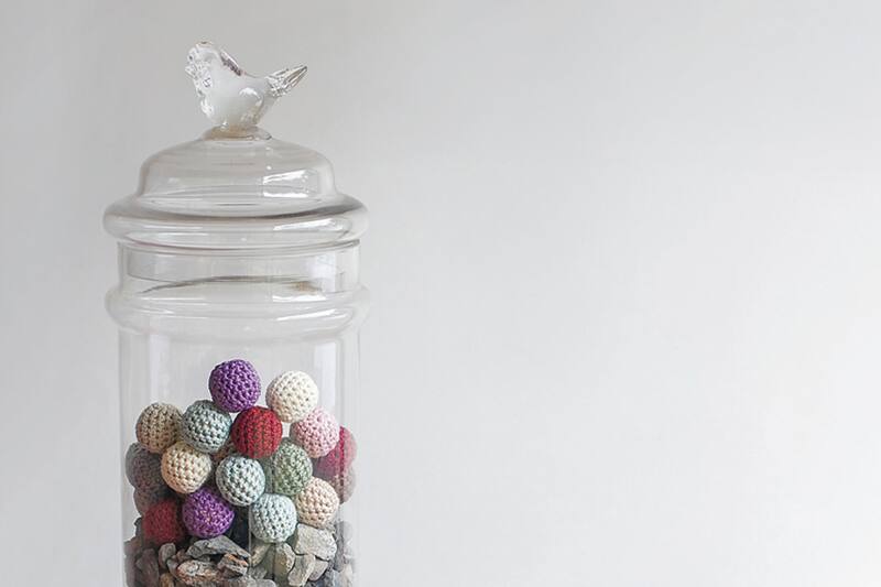 Confección: parte con un anillo mágico y teje 10 medios punto para la primera corrida; en la 2ª corrida aumentar un punto cada 2 p, tejer 10 corridas sin aumentar, meter una pelota de madera o plumavit y disminuir p por medio hasta cerrar todos los p. Rematar la hebra y repetir en diferentes colores.