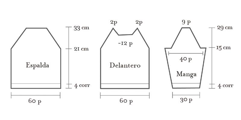 Mangas: urdir 30 p y tejer en p correteado por 4 corridas, cambiar a jersey aumentando 1 p por lado x 5 hasta tener 15 cm de alto y 40 p en total. Disminuir para sisa 2 p a cada lado y luego ídem delantero y espalda, hasta finalizar con 9 p la manga a los 29 cm de alto.