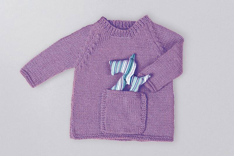 Terminación: para bolsillo urdir 30 p y tejer en p correteado por 6 corridas, cambia a p jersey dejando los 4 p de cada extremo correteados, cerrar p a los 13 cm. Coser espalda con delantero, mangas y cuerpo (calzar las sisas). Retomar los p dejados en espera y levantar el resto para tejer un cuello de 70 p en elástico simple por 8 corridas. Cerrar p.