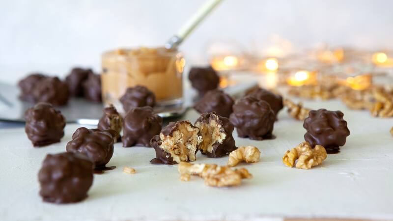 3. Derretir el chocolate a baño maría o en tandas de 20 segundos (ir revolviendo en cada tanda). Luego, pasar las nueces por chocolate y dejarlas secar encima de papel aluminio o mantequilla.
