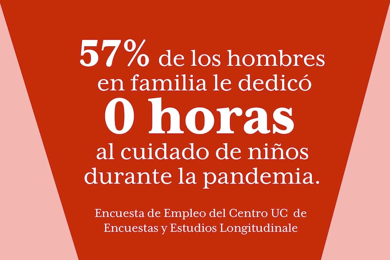 Y este estudio no es el único que lo ha demostrado. La última Encuesta de Empleo del Centro UC de Encuestas y Estudios Longitudinales ya había develado que el 38% de los hombres en familia destinó 0 horas semanales a las tareas domésticas durante la pandemia. Y que el 57% de los papás le dedicó 0 horas al cuidado de los niños.