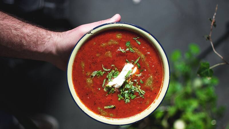 Con aceite de trufa y crema está hecha esta sopa de tomates, pimentones y cebollas asadas, acompañada de un grilled cheese en pan casero.