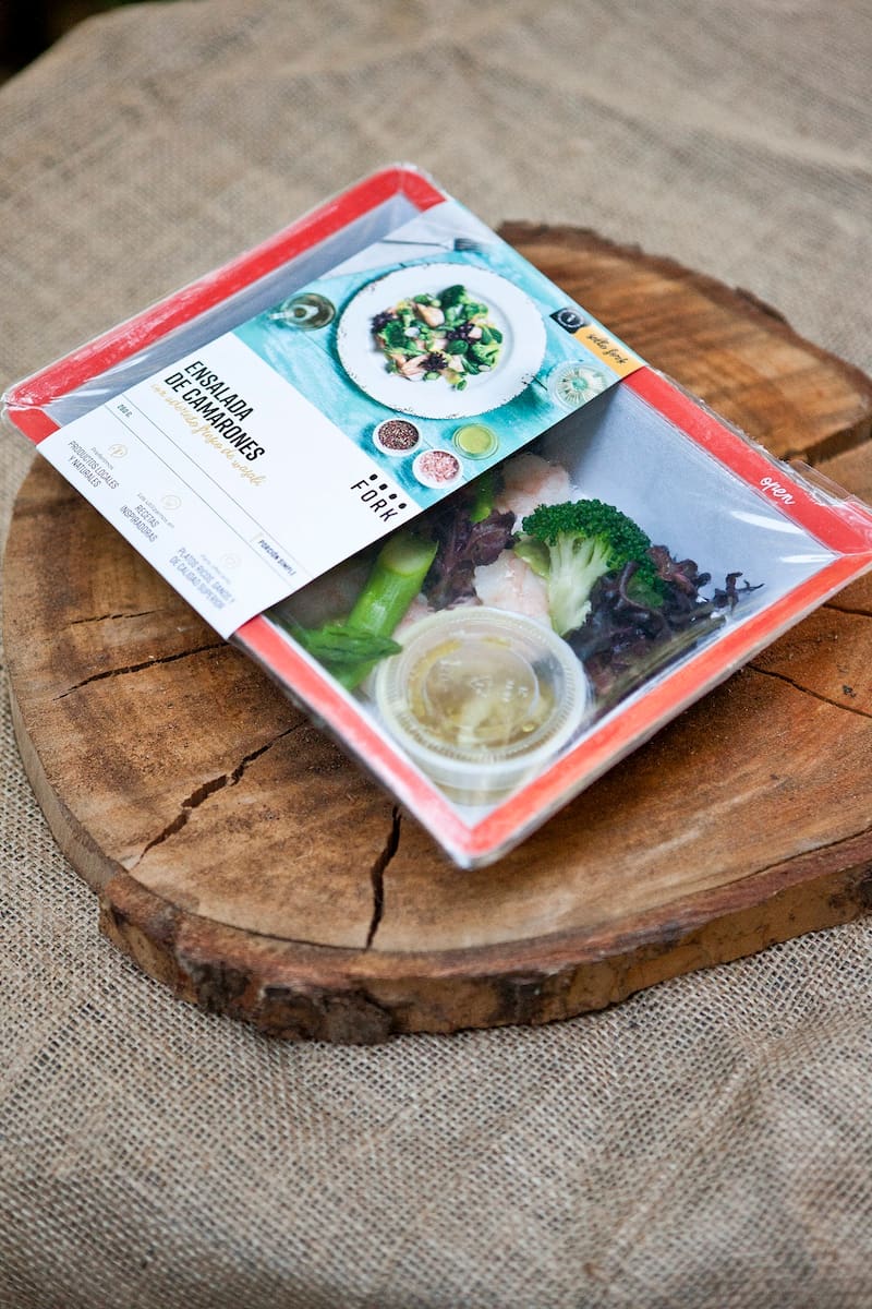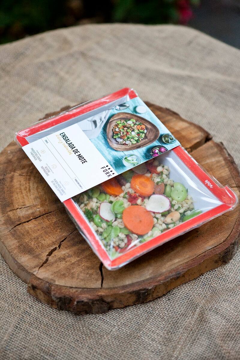 Los platos preparados –hay vegetarianos, veganos, sin gluten, carnes y pescados– vienen en una bandeja de cartón blanco reciclado con bordes rojos –tipo fuente antigua–, cubierta con un plástico transparente. Una vez que la persona termina de comer, aparece un mensaje en el fondo: "Se acabó tu comida, comienza el reciclaje". Y es que la bandeja se puede desarmar fácilmente y reciclarse en el momento, al igual que el plástico.