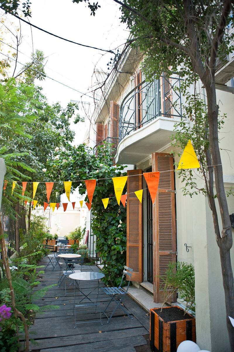 Banderines de colores que adornan la terraza. Ventanas altas con persianas de madera. Bicicletas negras nuevas para el servicio de delivery estacionadas en un bicicletero. Tachos de colores para reciclar y metros más allá, un mesón cubierto de pequeñas plantas, como ciboulette y orégano. Esto es lo primero que aparece al entrar a Fork, un nuevo almacén de barrio con estética moderna -como lo definen sus dueños-, que abrió sus puertas el 15 de febrero en una esquina justo en frente de la Plaza Las Lilas, en Providencia.