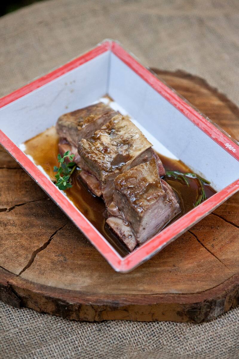 1. Asado de tira de ternera al romero. Es de carne de libre pastoreo de la IX Región y tiene un proceso de 14 horas de cocción a temperatura baja ($5.990 para dos personas).