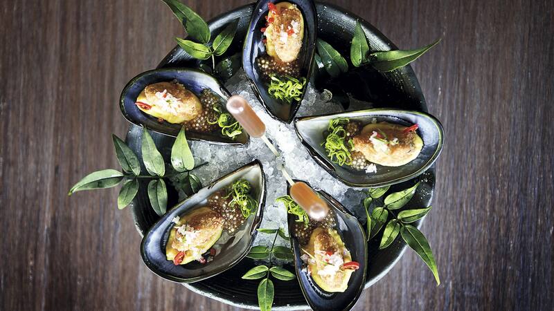 1. Mejillón chalaco: choritos a la chalaca sobre crema de frijol tierno y ají amarillo ahumado ($ 7.000).