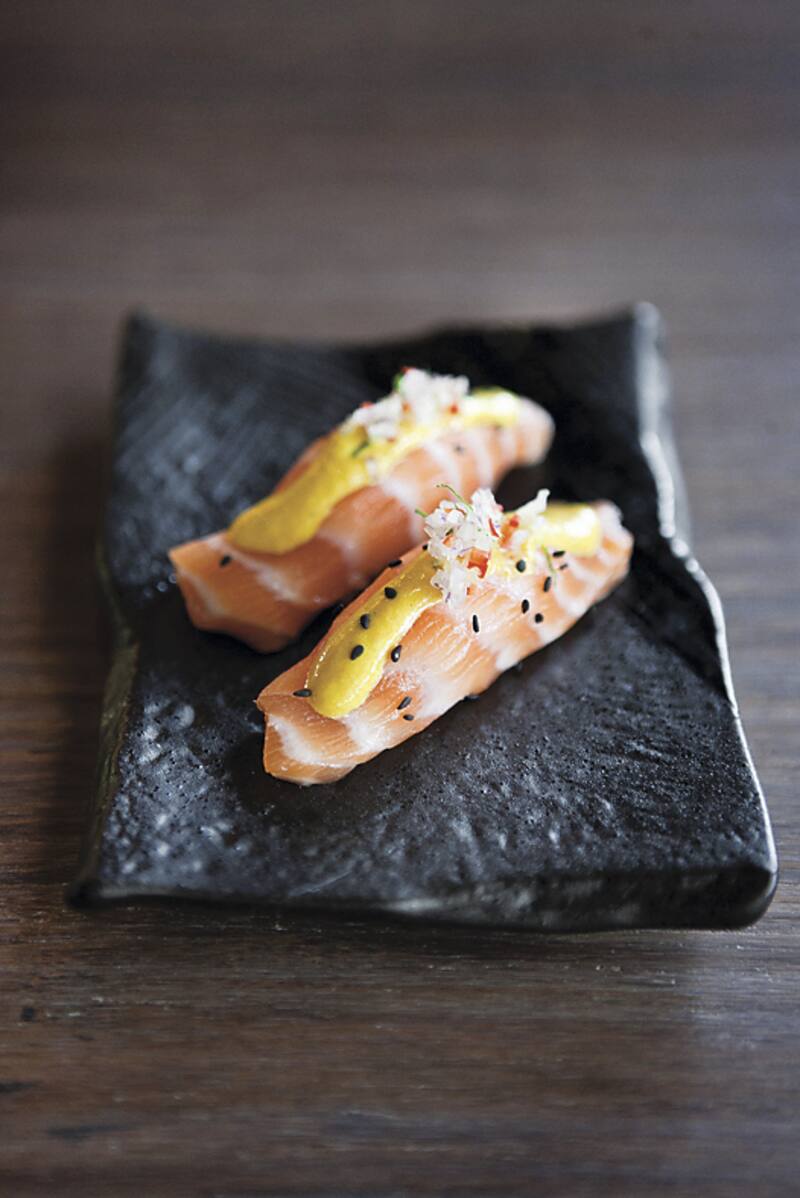 2. Salmón tiradito: nigiri de salmón con emulsión de ají amarillo y leche de tigre ($ 4.900).