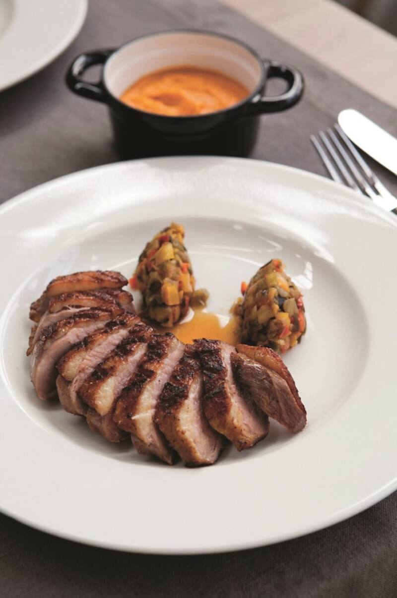 2. El pato cocinado a 76 °C por horas y sellado a la plancha logrando una crocancia perfecta en la grasa y servido con su propia salsa, acompañado de ratatouille y puré de camote. Un imperdible de la carta ($16.900).