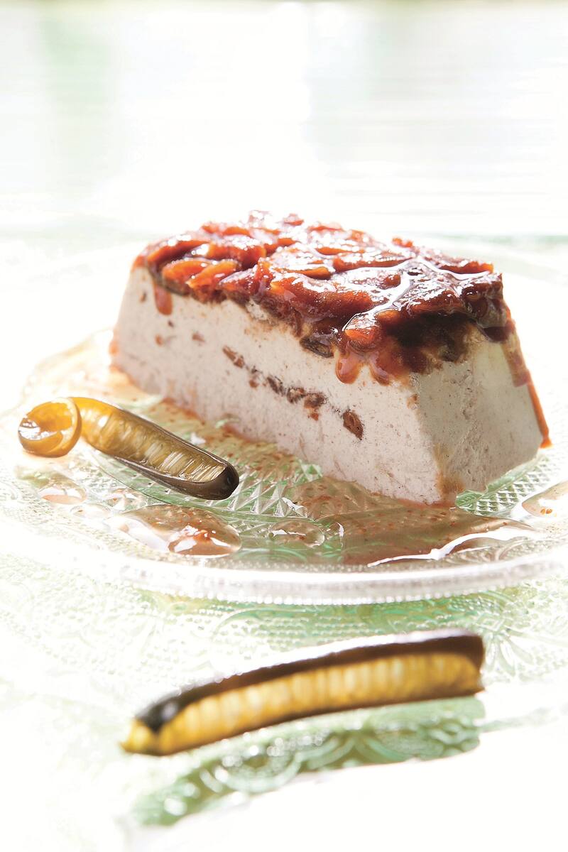 3. Antes de servir, desmoldar el semifrío, cortar en tajadas gruesas y servir en platos individuales.