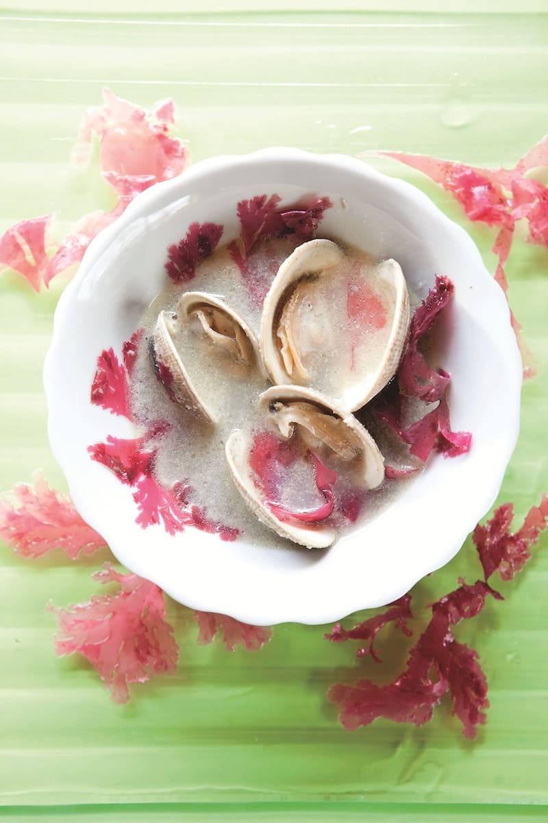 2. Volver el mismo sartén al fuego, verter el caldo de algas y llevar a ebullición. Retirar del fuego y verter el caldo sobre cada plato con almejas. Servir de inmediato.