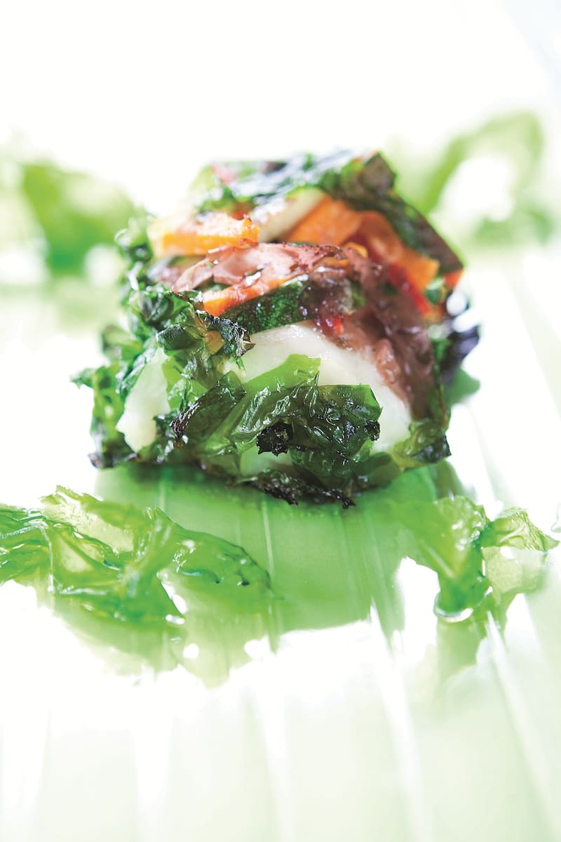 2. En una superficie lisa armar los papillotes; extender las láminas de alga lamilla sobreponiendo unas con otras, formando 4 círculos de 18 cm, colocar al centro de c/u un filete de merluza, distribuir encima la mezcla de verduras y una capa de algas carola. Envolver formando un paquete con láminas de alga lamilla, sobrepuestas una sobre otras. Pincelar con el resto del aceite la superficie del alga lamilla.