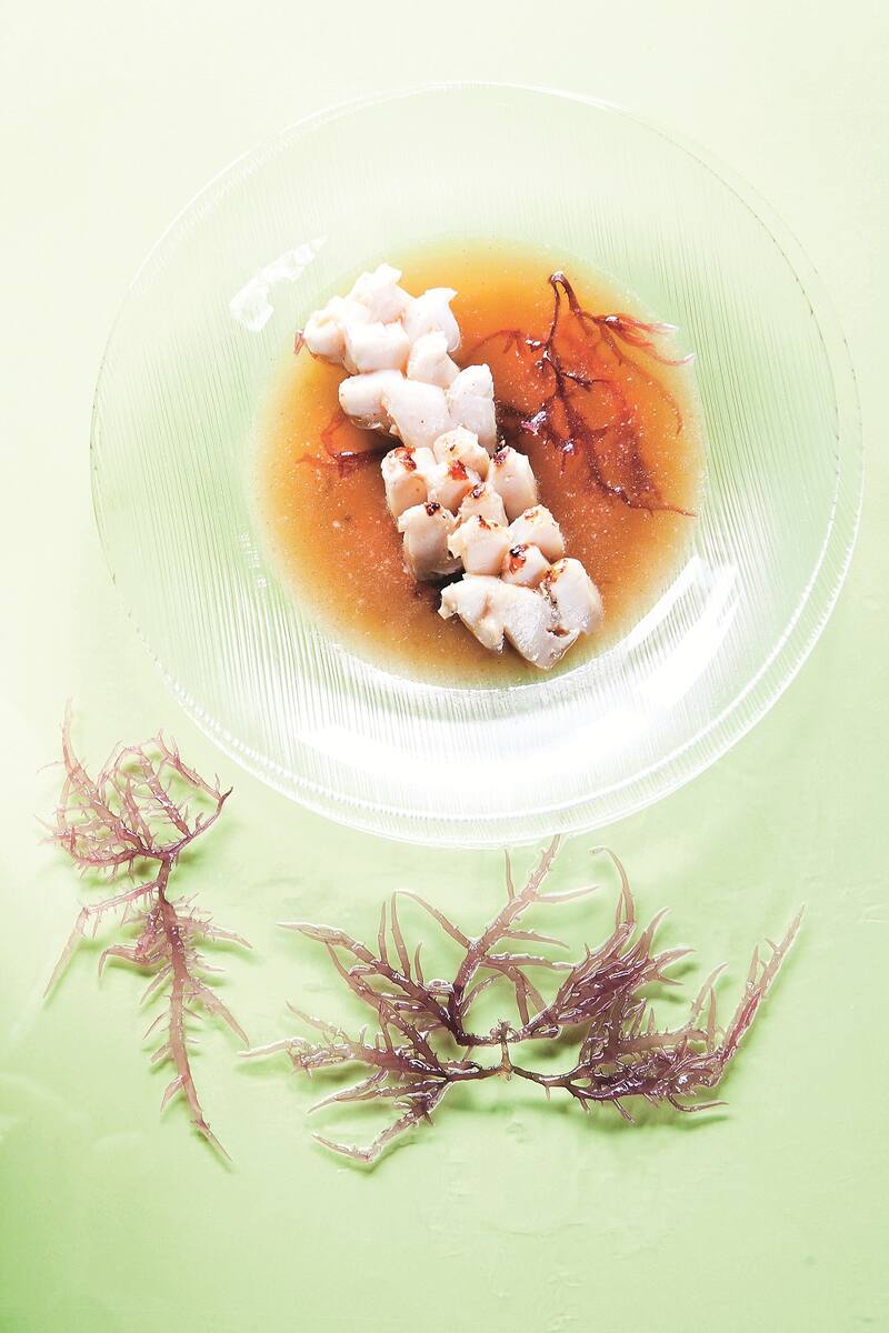 3. En platos hondos individuales colocar las algas hidratadas, encima las láminas de locos y verter el caldo de algas hirviendo. Espolvorear una pizca de sal sobre los locos y servir de inmediato.