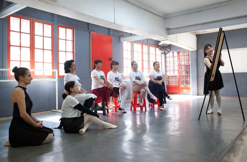 La profesora es Argyro Mouchliadou, una bailarina de origen griego que comenzó con este proyecto en agosto de este año. “Viví en Inglaterra dos años con mi familia y en ese tiempo estaba recién saliendo la certificación del método Silver Swans”, cuenta. Se trata de un proyecto de danza de ballet para personas mayores de 55 años, creado por la Royal Academy of Dance del Reino Unido. Son –como dice en la web en donde se imparte la certificación– “clases introductorias de ballet que buscan una forma divertida y de bajo impacto para mantener activas a las personas mayores. Se incorporan hermosas composiciones de música clásica con segmentos de movimientos de ballet alcanzables para inspirar y desafiar a su bailarina interior”.