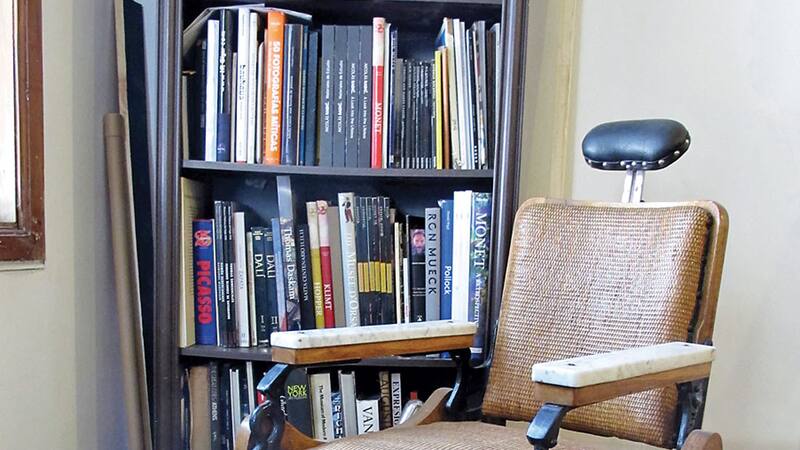 Antiguo sitial de barbero de madera, junco, fierro y mármol. Se puede ajustar la posición del respaldo y apoya pie, lo que permite un uso hoy como sillón de descanso o lectura.[/caption]