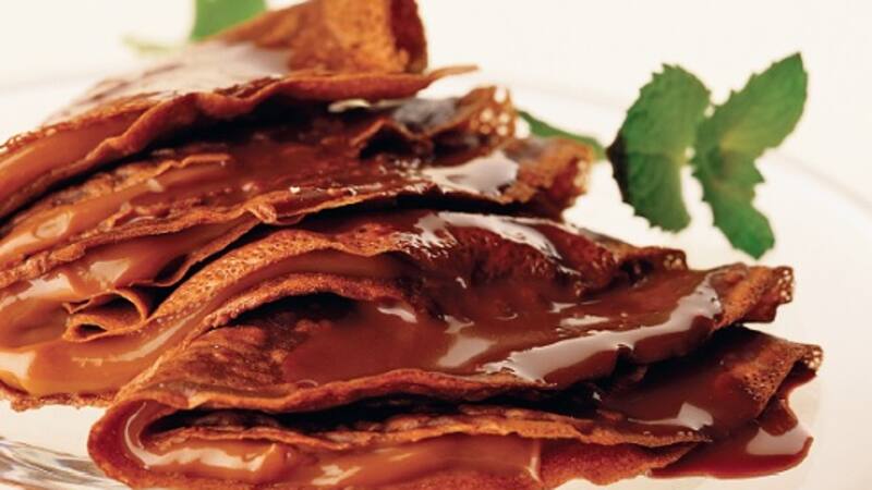 6. En platos individuales colocar 3 panqueques rellenos, colocar encima un poco de la salsa de chocolate y servir.