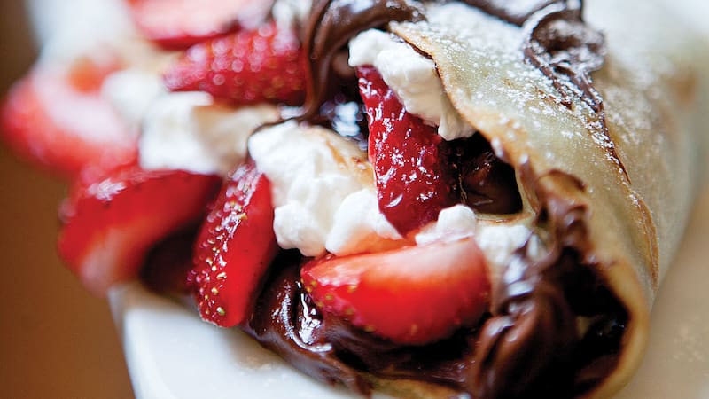 Panqueques con nutella, compota de frutillas y crema chantilly