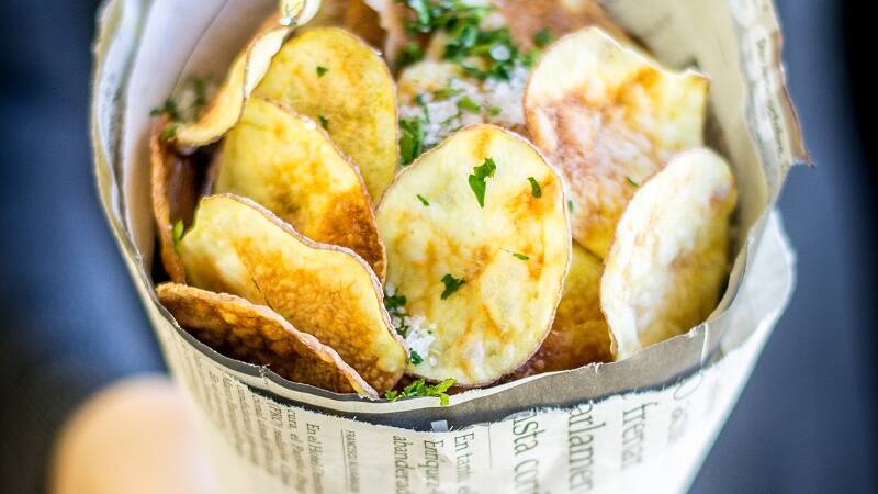 * Recuerda revisar las papas chip mientras se cocinan, ya que si están muy delgadas pueden quemarse en un abrir y cerrar de ojos.
