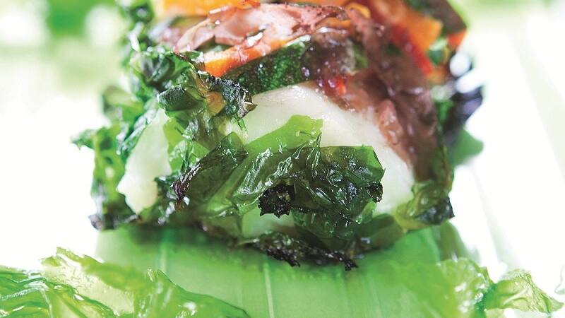 2. En una superficie lisa armar los papillotes; extender las láminas de alga lamilla sobreponiendo unas con otras, formando 4 círculos de 18 cm, colocar al centro de c/u un filete de merluza, distribuir encima la mezcla de verduras y una capa de algas carola. Envolver formando un paquete con láminas de alga lamilla, sobrepuestas una sobre otras. Pincelar con el resto del aceite la superficie del alga lamilla.