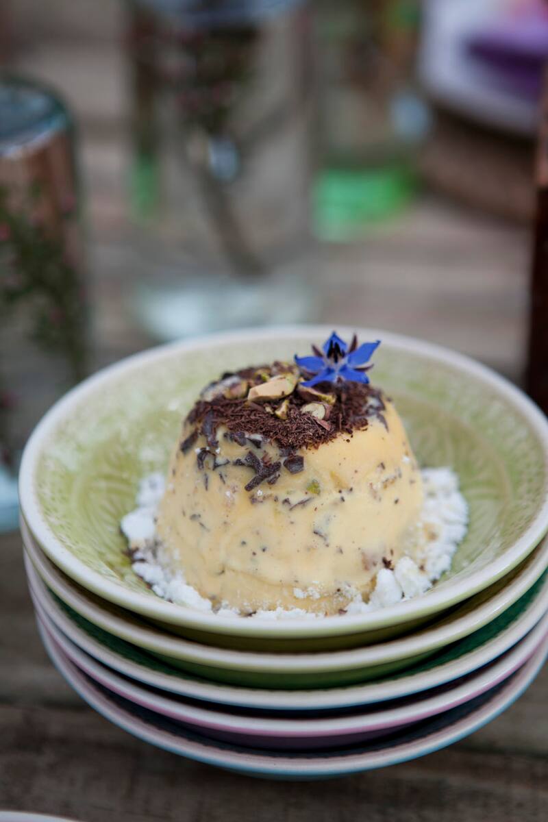 Parfait de vainilla, chips de chocolate, galletas y pistachos