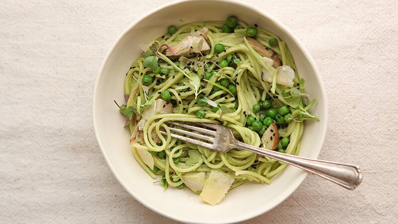 Esta pasta verde de Antonia Cafati (@brotesyraices) se sirve a temperatura ambiente o fría, con sésamo y hojas verdes.