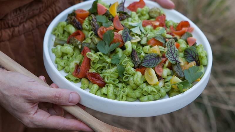 5. Mientras los vegetales están en el horno poner a cocer la pasta a elección como indique el envase. Luego colar, dejar enfriar y mezclar con el pesto.