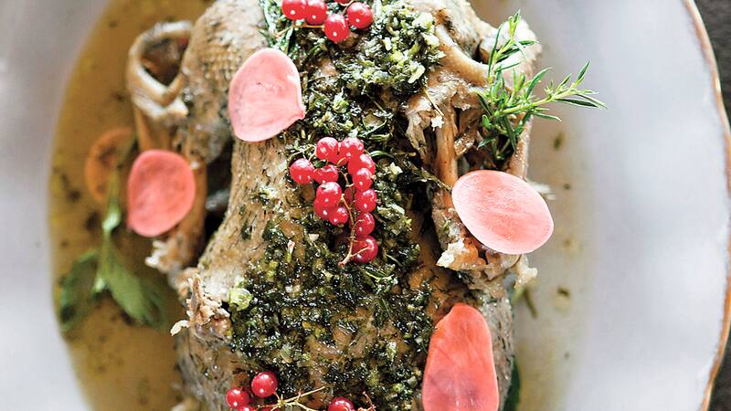 2. En un bol mezclar la mostaza, ajo negro, sal de mar, aceite, hierbas, miel, grasa del pato y 200 ml del caldo reservado. Pincelar el pato con la mezcla anterior, verter el resto del caldo y hornear 30 minutos a fuego medio. Retirar del horno y servir de inmediato decorado con zarzaparrillas y rábanos.