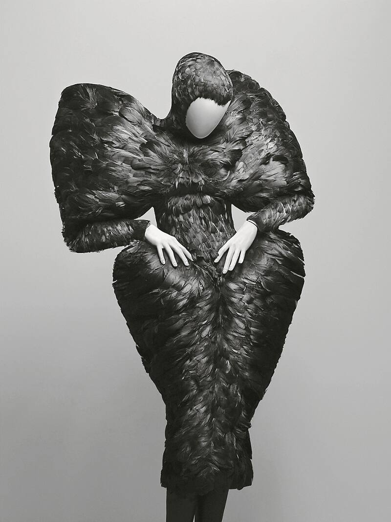 El cuerno de la abundancia fabricado con plumas de pato teñidas de negro, también presentado en la colección póstuma de McQueen en el MET. Fotografía: Metropolitan Museum of Art de Nueva York.[/caption]