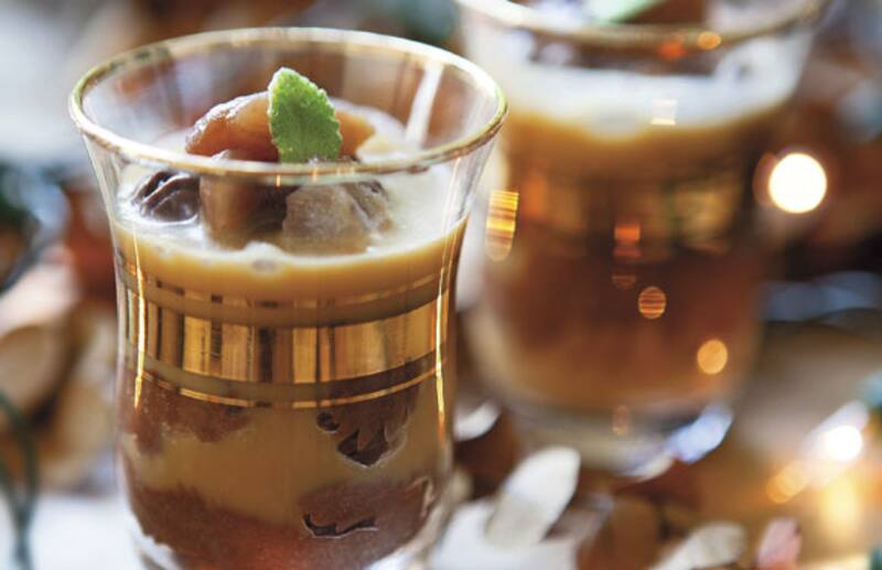 5. En 8-10 vasos pequeños distribuir el mousse de chocolate alternando con los trozos de castañas. Verter encima 1-2 cucharadas de la salsa butterscotch. Servir de inmediato.