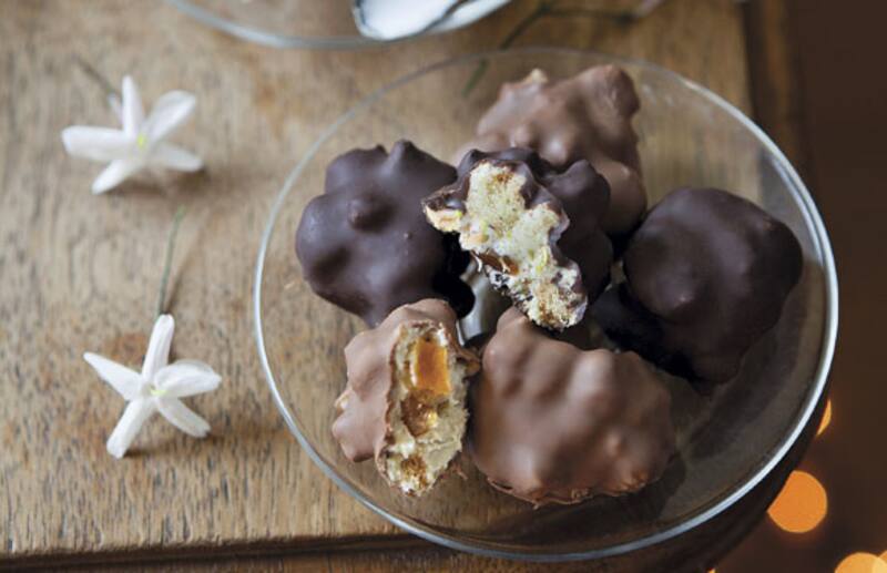 - Crocante de chocolates con pistachos y damascos secos (para 16 unidades)