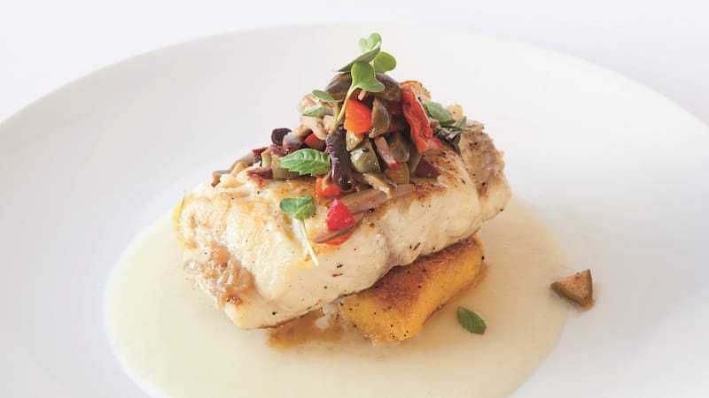 Pescado de roca con polenta sellada sobre emulsión de ajo y limón con aceitunas y verduras asadas