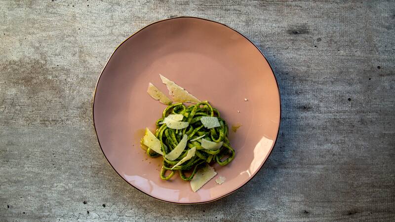 2. Si se hace con fetuccini, cocer según las indicaciones del fabricante y cuando estén listos escurrir y mezclar con el pesto, revolviendo bien. Terminar con las escamas de queso encima y servir.