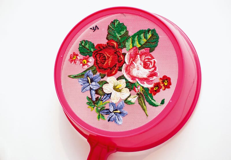 Enamorada del bordado, la artista visual Valeria Faúndez (32) interviene con sus hilos todo objeto que se le cruce. Su objetivo, dice, es convertir lo útil en estético. Así, ha bordado coladores, tapas de sartenes, botellas de detergentes y también retratos realistas en papel.