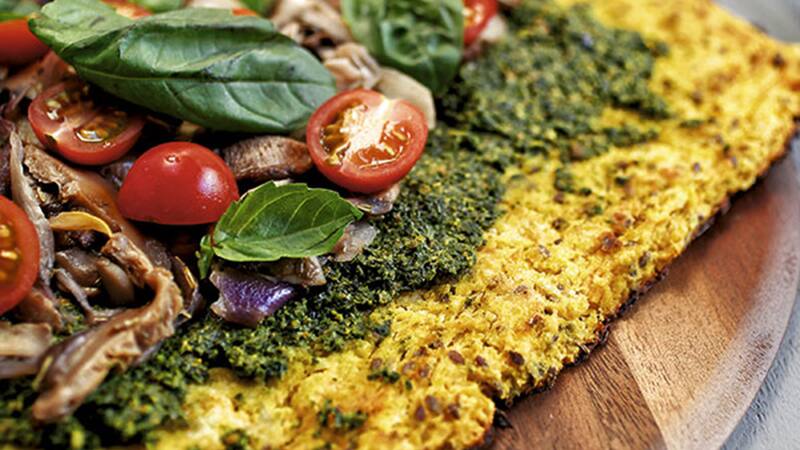 5. Esparcir pesto sobre la base de la masa horneada y agregar la mezcla de setas y decorar con los tomates cherry cortados en dos y la albahaca. Salpimentar y servir.