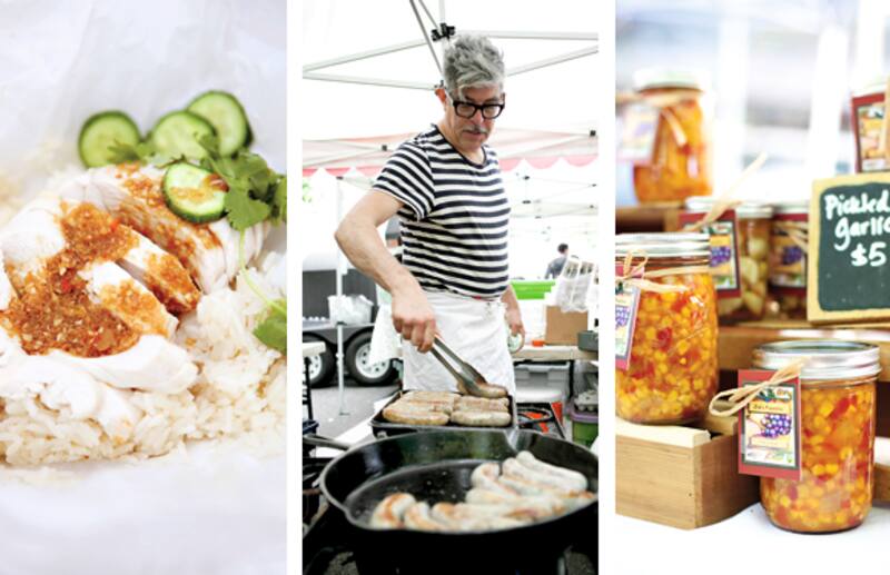 Foto 1. Aclamada por la revista Bon Appétit es la cocina tailandesa del carro Nong's Khao Man Gai, que solo ofrece arroz con pollo y salsa de jengibre, ajo, azúcar, ají y porotos de soya fermentados (US$ 8, 1003 SW Alder St). Foto 2 y 3. En los mercados de barrio que se encuentran por montones en Portland, además de frutas y verduras, abundan los puestos de comida al paso y productos elaborados, como pickles, panes, pasteles, mermeladas y chocolates.