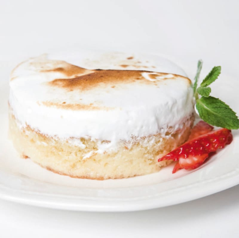 7. Preparar el merengue. En un bol batir las claras con la batidora eléctrica hasta que estén firmes y verter, de a poco y sin dejar de batir, el almíbar caliente. Batir 5 minutos más o hasta que el merengue esté frío y cubrir toda la superficie del postre. Cortar en porciones y servir decorado con hojas de menta y fruta fresca.