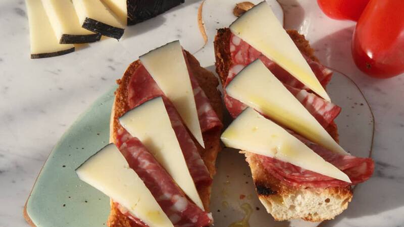 4. Rociar el pan con aceite de oliva y añadir sal. Finalmente cubrir con salame español y láminas de queso ibérico.