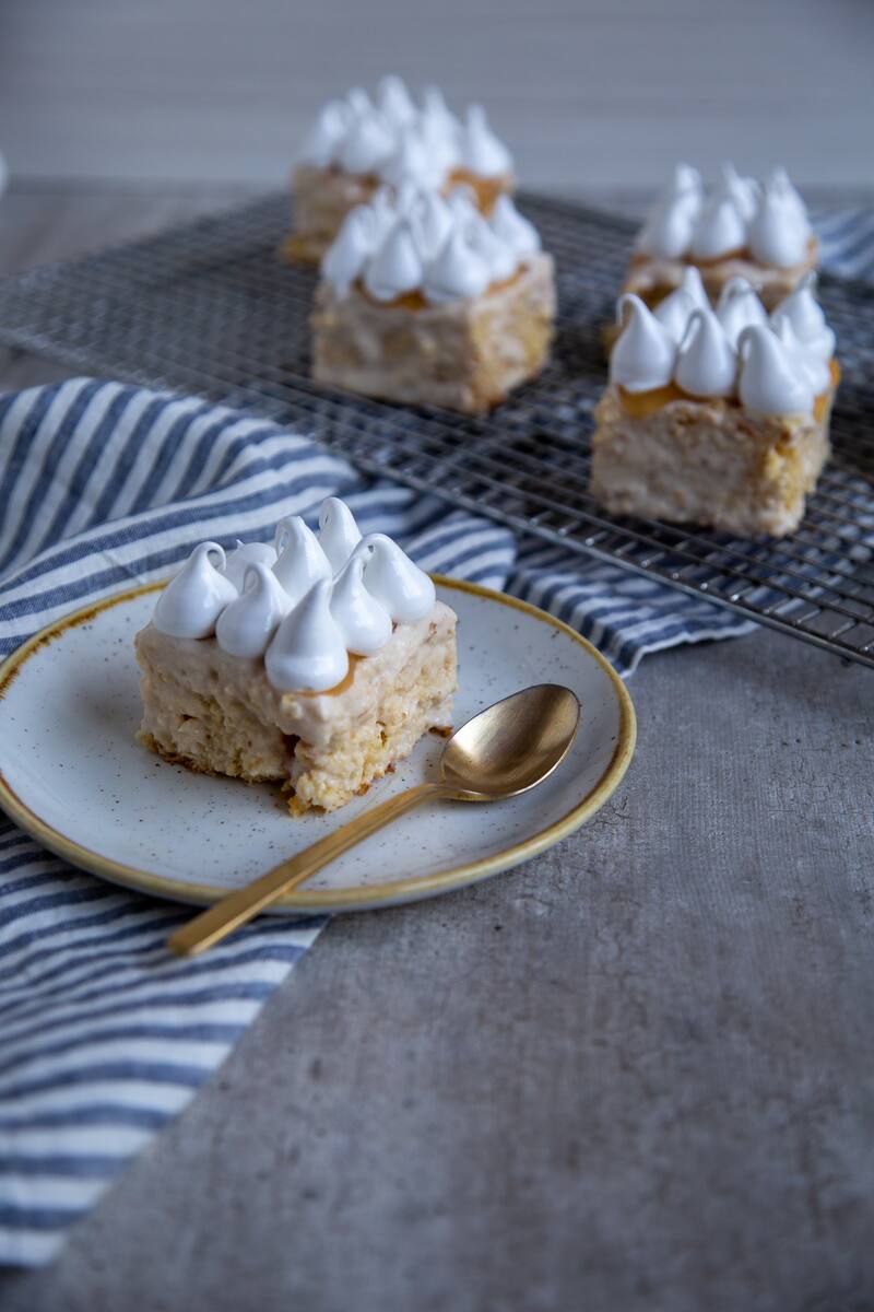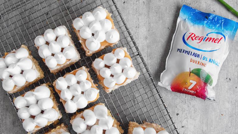 - Sobre el bizcocho remojado, agregar una capa más de mermelada de durazno Regimel a gusto y luego cubrir con el merengue. Refrigerar hasta servir.