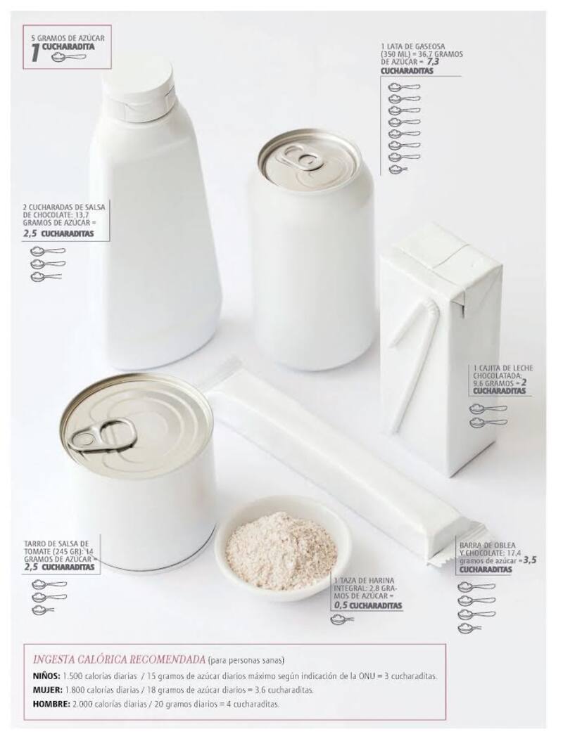 Una taza de leche con chocolate (2 cucharaditas de azúcar) al desayuno. Un jugo de piña en cajita (5 ½ cucharaditas) y un yogurt regular de frutilla (3 cucharaditas) de colación. Aún no llega la hora de almuerzo y un niño de 5 años ya ha ingerido 10½ cucharaditas, unos 52,5 gramos de azúcares libres. Un niño sano a esa edad tendría que consumir 1.500 calorías diarias y de ese total solo el 10%, 15 gramos, debiese corresponder a azúcares libres según las directrices de la OMS.