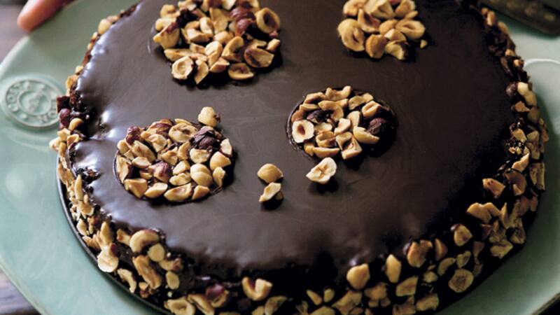 5. Preparar el glaseado. En otro bol colocar el chocolate y café o licor y derretir a bañomaría. Retirar del fuego y agregar, de a poco, batiendo, la mantequilla. Con una espátula cubrir la superficie y los bordes del queque. En forma decorativa distribuir las avellanas picadas reservadas sobre la superficie y los bordes.