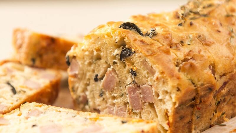 Queque salado de jamón, queso provoleta y aceitunas