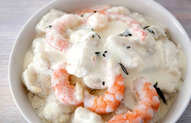 6. En platos individuales distribuir los ñoquis reservados, verter encima la salsa de camarones y servir de inmediato.