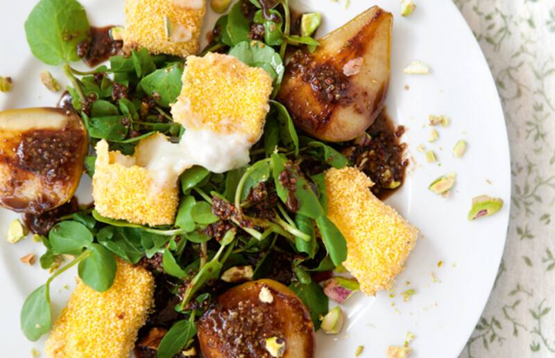 5. En platos individuales colocar al centro los berros, alrededor los trozos de queso apanado y peras acarmelados. Verter encima el aliño reservado, espolvorear con los pistachos y servir de inmediato.