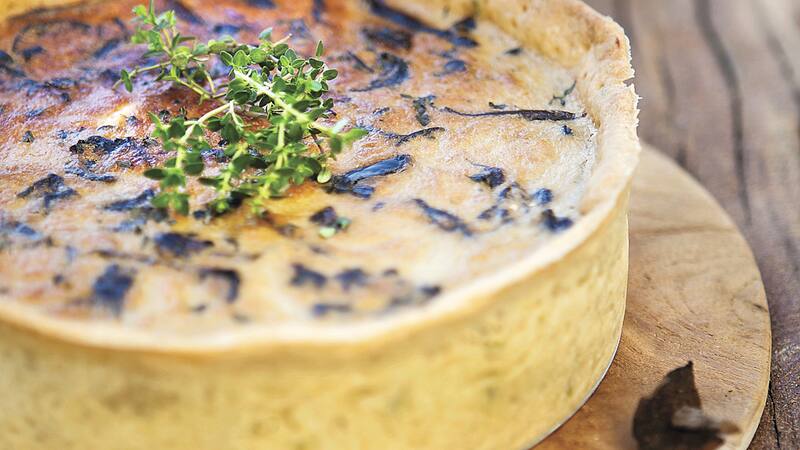 6. En el molde reservado distribuir el pollo sobre la masa horneada, luego añadir los hongos reservados y verter encima la mezcla de huevos. Hornear 45-50 minutos o hasta que el relleno esté cuajado y dorado. Retirar del horno y servir de inmediato.