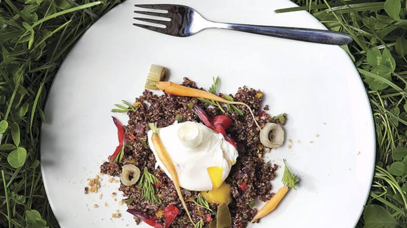 Quínoa roja con vegetales, queso de cabra y huevo pochado