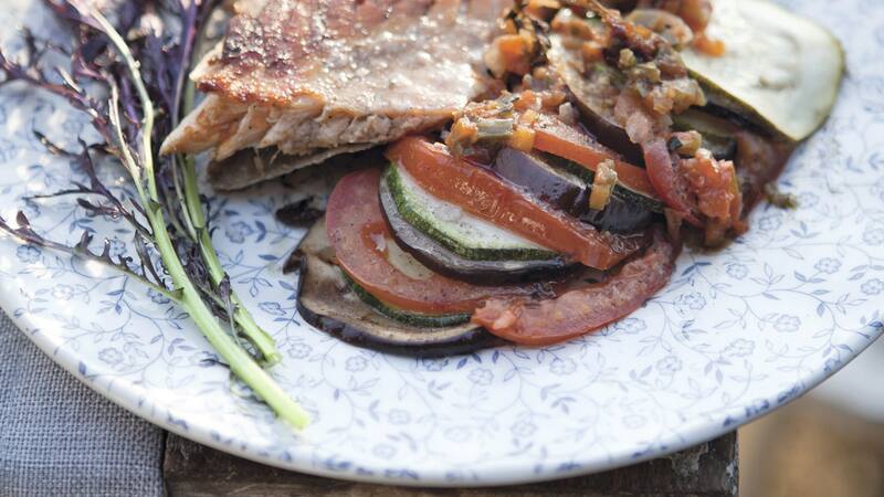 3. Tapar el sartén con papel metálico, colocar sobre la parrilla a fuego medio durante 30 minutos o hasta que las verduras estén tiernas por dentro.