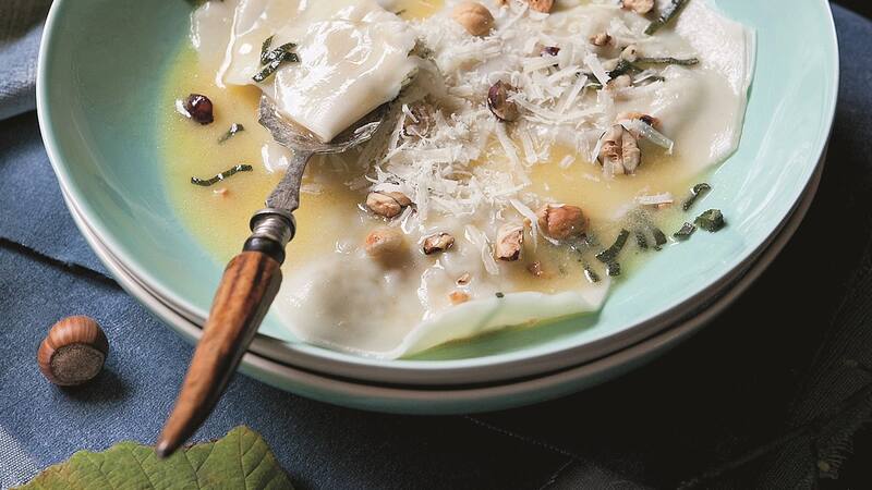 Ravioles de queso de cabra, avellanas y hierbas con mantequilla de salvia y avellanas