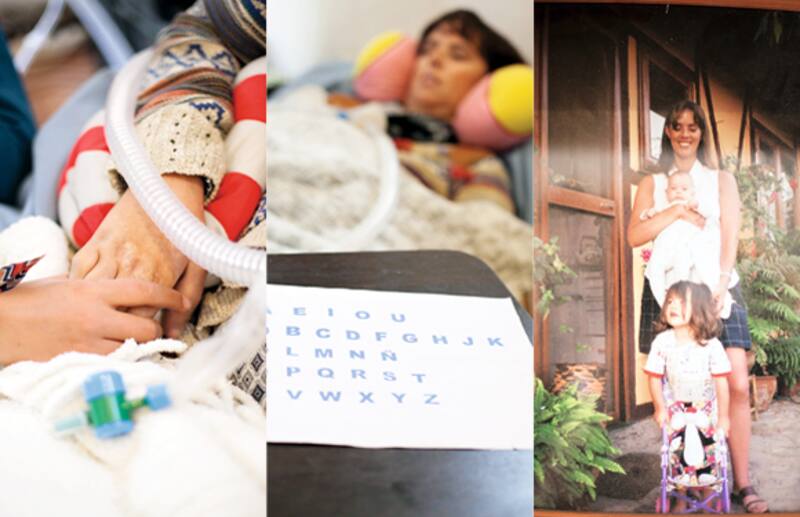 El verano de 2012 Andrea fue internada de urgencia en la UTI por una insuficiencia respiratoria aguda. Las primeras 72 horas estuvo con alto riesgo vital, sedada y conectada a ventilación mecánica. Tuvieron que hacerle una traqueotomía, para mantenerla conectada al ventilador mecánico y una gastrostomía. "Mi papá estaba con los ojos llorosos y, aunque no me decía que mi mamá se podía morir, igual se le notaba. La primera noche me la lloré entera. La noche siguiente me tomé una pastilla para dormir, porque sabía que tenía que estar todo el día con mi mamá, para ayudarla a comunicarse en caso de que despertara", cuenta Macarena, que entonces tenía 14 años y su hermana Antonia, 12. "Hicimos la función de traductoras y por eso nos dejaban entrar a la UTI, al principio, aunque no se permitían menores de 15 años", agrega. Desde las 8 de la mañana hasta la medianoche, Macarena y Antonia se turnaban para estar junto a su mamá. Se llevaban una mochila con colación, libros y calcetines de pólar. Para poder pasar sin problemas, todos los días espiaban la nueva clave que tecleaban las enfermeras, la repetían y entraban de nuevo. Si alguien se asomaba, se escondían debajo de la cama. "Mi mamá estaba muy mal, pero esas cosas le daban risa", dice Antonia. Después del trabajo llegaba el marido, Luis Ibacache, a pasar la noche al lado de su mujer.